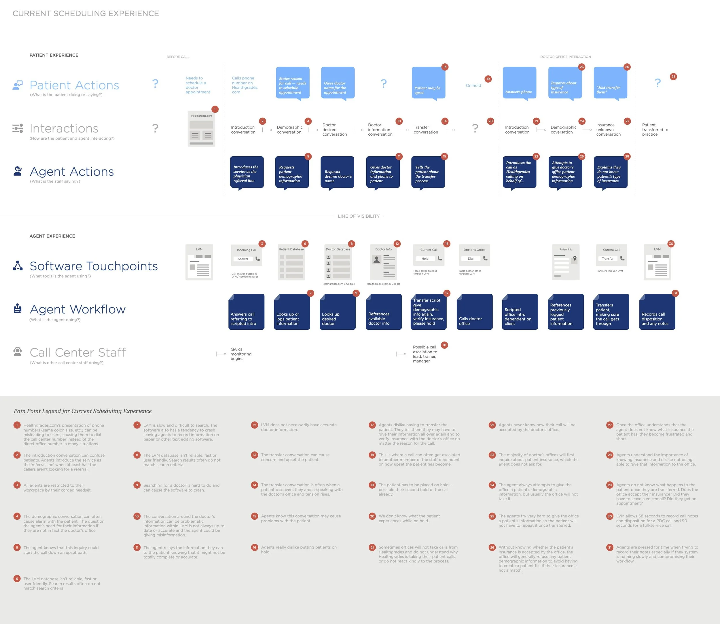 To begin, I identified key stakeholders and users, including agents, patients, practices, and hospitals. I conducted stakeholder interviews and audited the patient self-service scheduling tool, documenting key steps within the workflow, data capture and integrations, components, and consumer messaging. I also audited the consumer site to understand where patient data was being captured across the site and how it might be repurposed to consolidate within the new workflow.